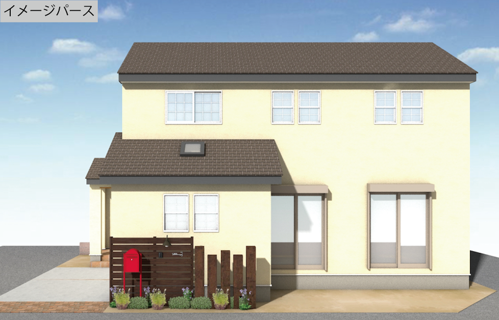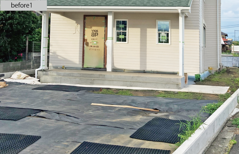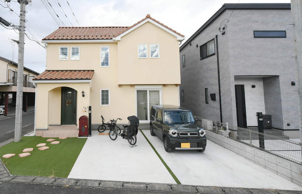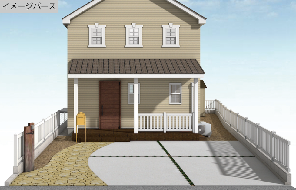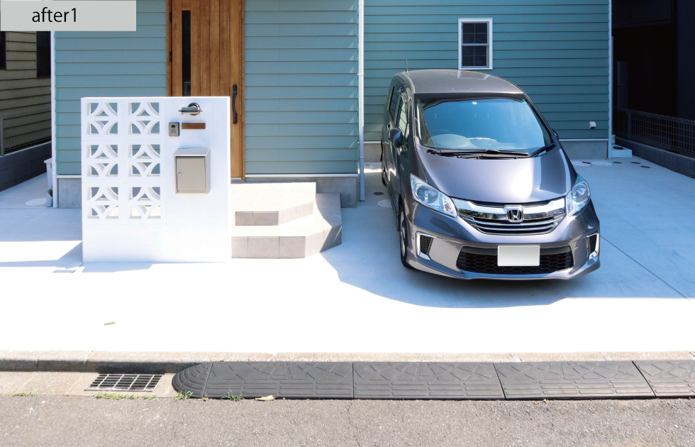 装飾せず駐車場の土間打ち+ ポストなどシンプルに仕上げたオープンな外構デザイン。